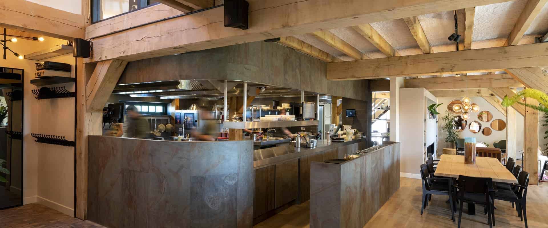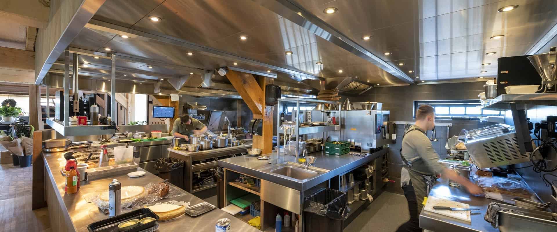 Allereerst zorgden we voor de elektrotechnische werkzaamheden, zoals de diverse lichtpunten binnen en buiten. Ook de brandmeldinstallatie, inbraakinstallatie, data-installatie, camera’s, de e-aansluitingen voor alle barren beneden en boven, en de alle bekabeling voor de afzuiginstallaties namen we voor onze rekening. Voor de verlichting kozen we voor domotica. Met één druk op de knop kan van volledige verlichting naar de ‘borrelstand’ worden geschakeld. En wanneer de keuken sluit, kan de verlichting hier naar twintig procent worden gezet zodat de gasten kunnen genieten van een prettige sfeerverlichting op de achtergrond. En wordt er afgesloten, dan schakelt het alarm automatisch in en gaat alle verlichting binnen automatisch uit.